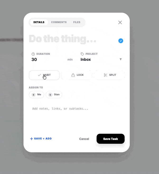 I knew, though, that one important element of this app would be habit tracking. It would need to seamlessly integrate into the process of creating a task. No separate tool. No complex dashboard. No judgement if you missed a day.